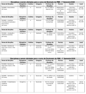Horário e cronograma das disciplinas a serem ofertadas no 1º semestre/2026