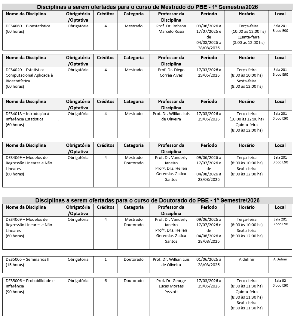 Segue abaixo, os editais de abertura da matrícula para alunos regulares e não regulares, junto às disciplinas ofertadas pelo Programa de Pós-Graduação em Bioestatística – 1º Semestre 2026!!!